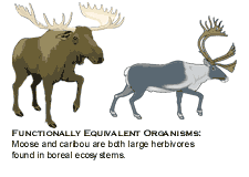 (e.g. moose and caribou are both large herbivores in boreal ecosystems;